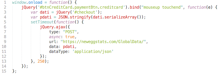 On August 14th, the group injected their skimmer script into the payment processing page of the official retailer website. When customers made payment, the attackers were able to access their payment details and send them to the domain neweggstats(dot)com they had set up.