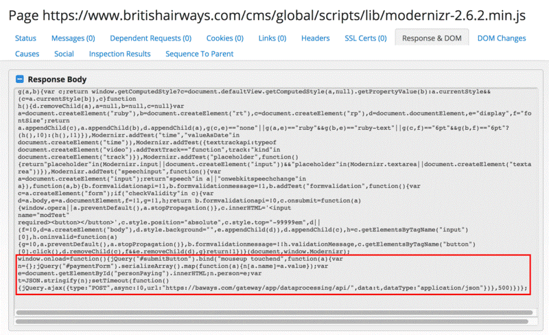 The malicious script was loaded from the baggage claim information page on the British Airways website. The code added by the attackers allowed Modernizr to send payment information from the customer to the attacker’s server.