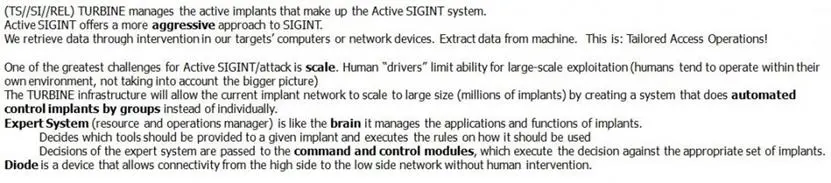 "One of the greatest challenges for active SIGINT/attack is scale," explains the top-secret presentation from 2009. "Human 'drivers' limit ability for large-scale exploitation (humans tend to operate within their own environment, not taking into account the bigger picture)." The agency's solution was TURBINE. Developed as part of TAO unit, it is described in the leaked documents as an "intelligent command and control capability" that enables "industrial-scale exploitation."