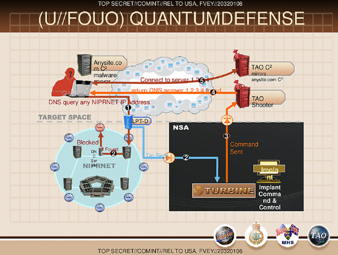 The above slide on QUANTUMDEFENSE shows the capability of the NSA to manipulate DNS requests for NIPRnet IP addresses. The experts of the agency are able to inject bogus DNS replies redirecting the victims to a website controlled by the NSA.