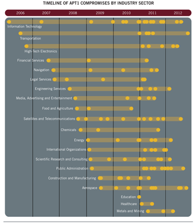 For the last decade, the Chinese have systematically targeted and exfiltrated sensitive information from the US government, as well as private sector entities. The following figure is a timeline of cyber-espionage attacks originating from China covering the years 2006-2012, delineated by industry sector.