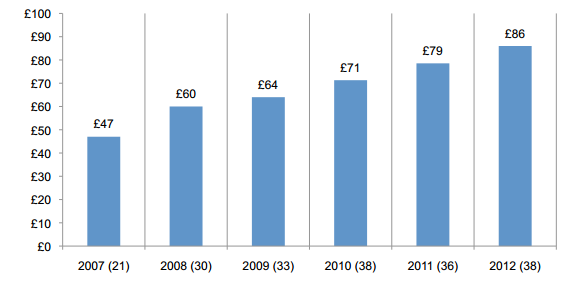 Lost business cost has nearly doubled over the last six years, also ex-poste response and detection costs (e.g., activities that attempt to address victims', regulators', and plaintiff counsels' concerns about the breach incident, legal and consulting fees that attempt to reduce business risk and liability) increased from approximately £451 thousand in 2011 to £508 thousand in 2012..