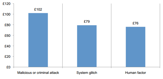 Cost of data breaches due to system or business process failures was £79 and the loss for data breaches caused by the employee or contractor negligence was £76 per compromised record.
