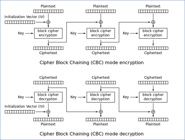 Below diagram shows the process through which CBC works. As we can see the encryption in this attack is sequential and not parallelized which is also the disadvantage of CBC mode.
