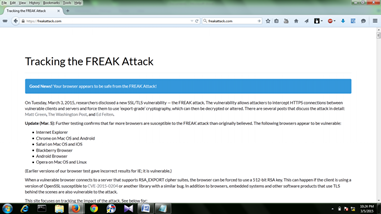 To check whether your browser is vulnerable to this attack or not, visit freakattack.com. If your browser is safe from the FREAK attack, then it will prompt a message, 'Good News! Your browser appears to be safe from the FREAK Attack!' Otherwise it will prompt a warning message that your browser is vulnerable to CVE-2015-0204. The best way to make yourself free from this attack is to update your browser.